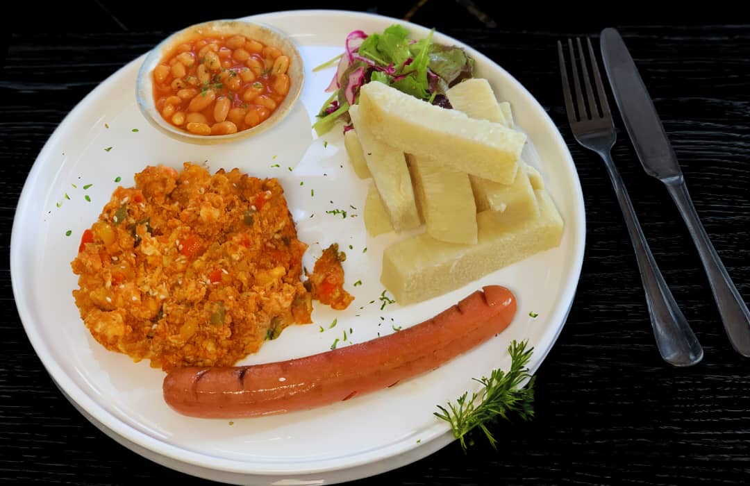 Sausage, Traditional Eggs Sauce Infuse Asian Style, Baked Beans, with your choice of yam or Plantain