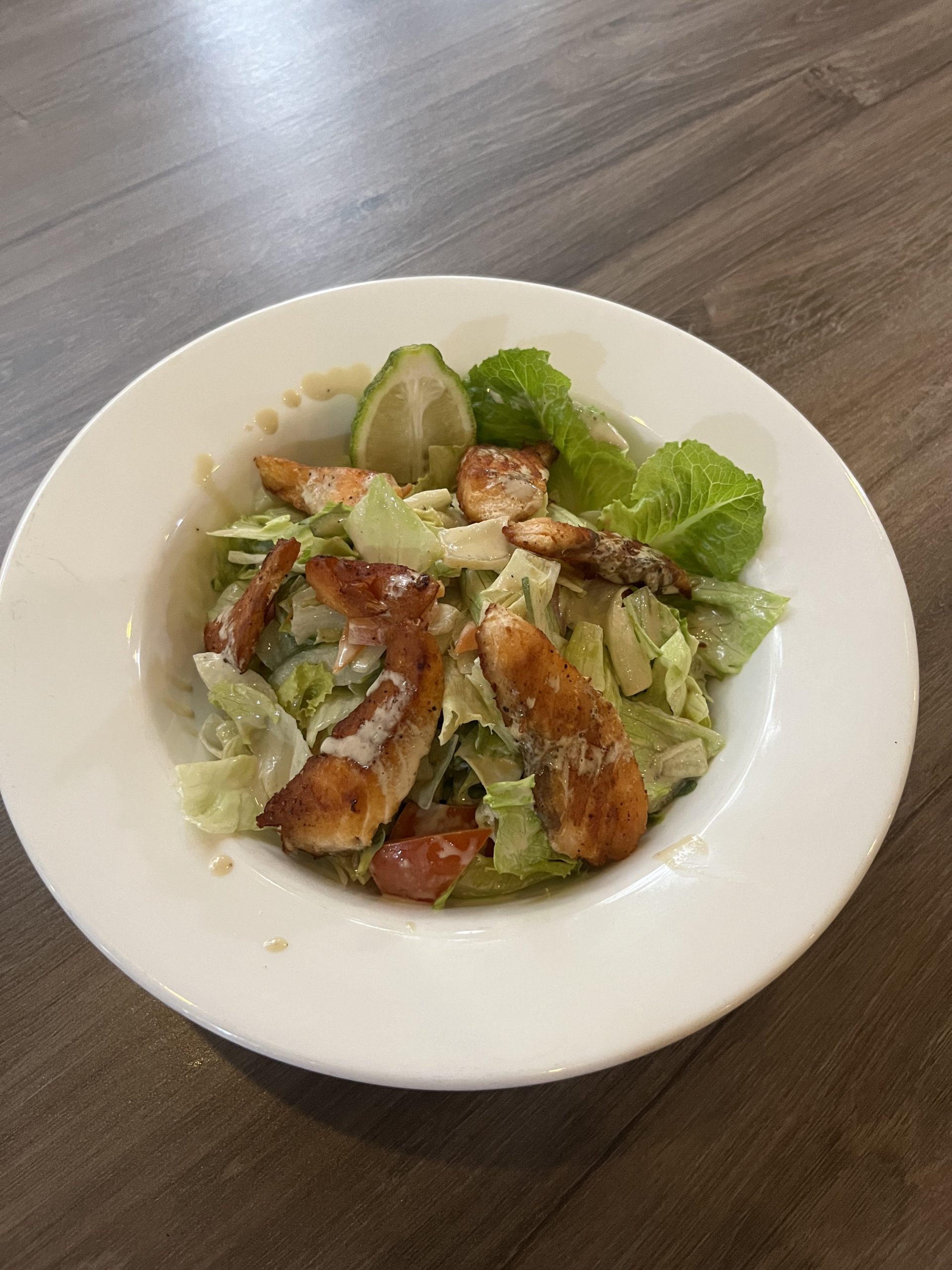A Refreshing Salad Featuring Crisp Iceberg Lettuce and Juicy Cherry Tomatoes, Paired with a Zesty Lemon Mustard Sauce. Topped With a Perfectly Grilled Steak Salmon Fillet, This Light and Flavorful Dish Offers the Perfect Balance of Freshness and Richness.