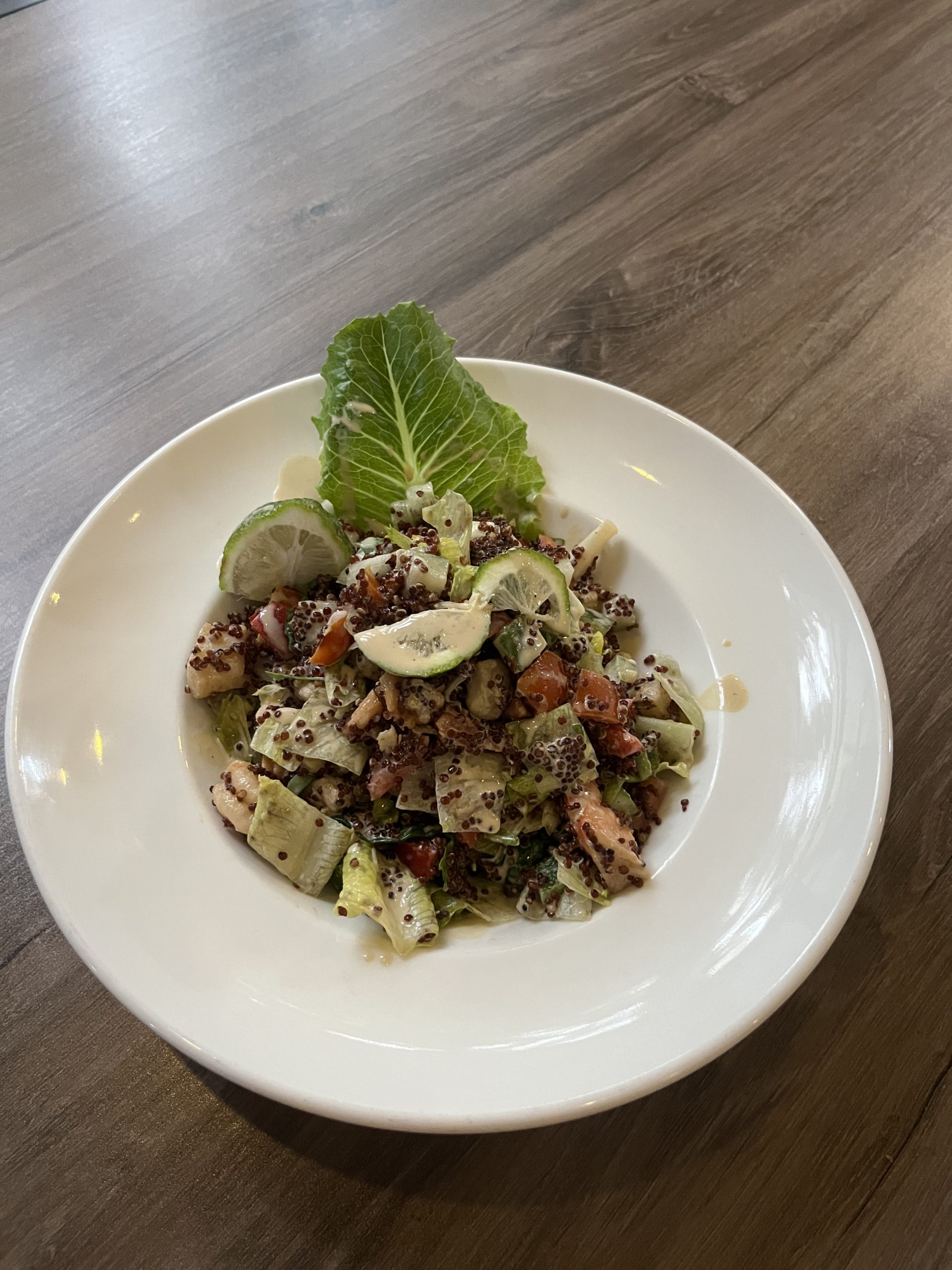 A Refreshing Iceberg Salad with Juicy Cherry Tomatoes, paired with a Zesty Lemon Mustard Sauce & Topped with a Perfectly Grilled Steak Salmon Fillet.