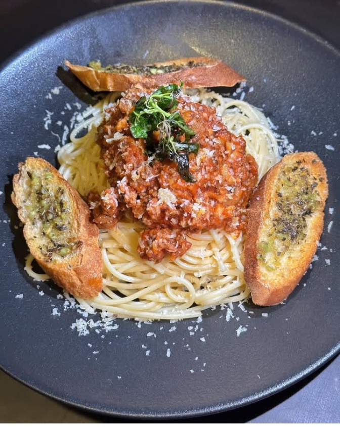 Sauteed mincemeat simmered in tomato sauce &mushroom, spaghetti pasta topped with parmesan cheese
